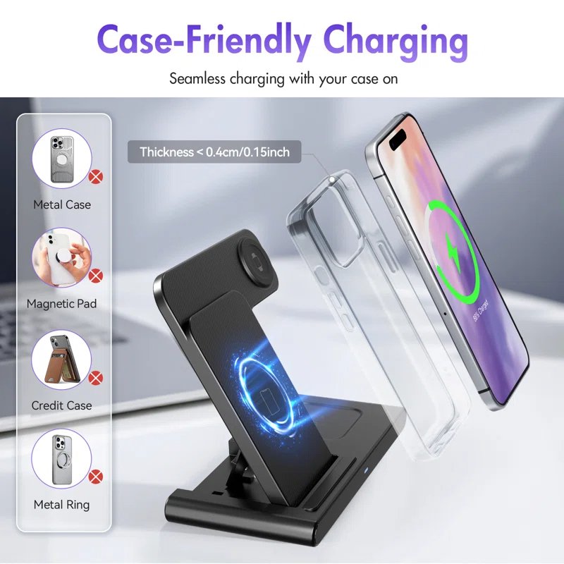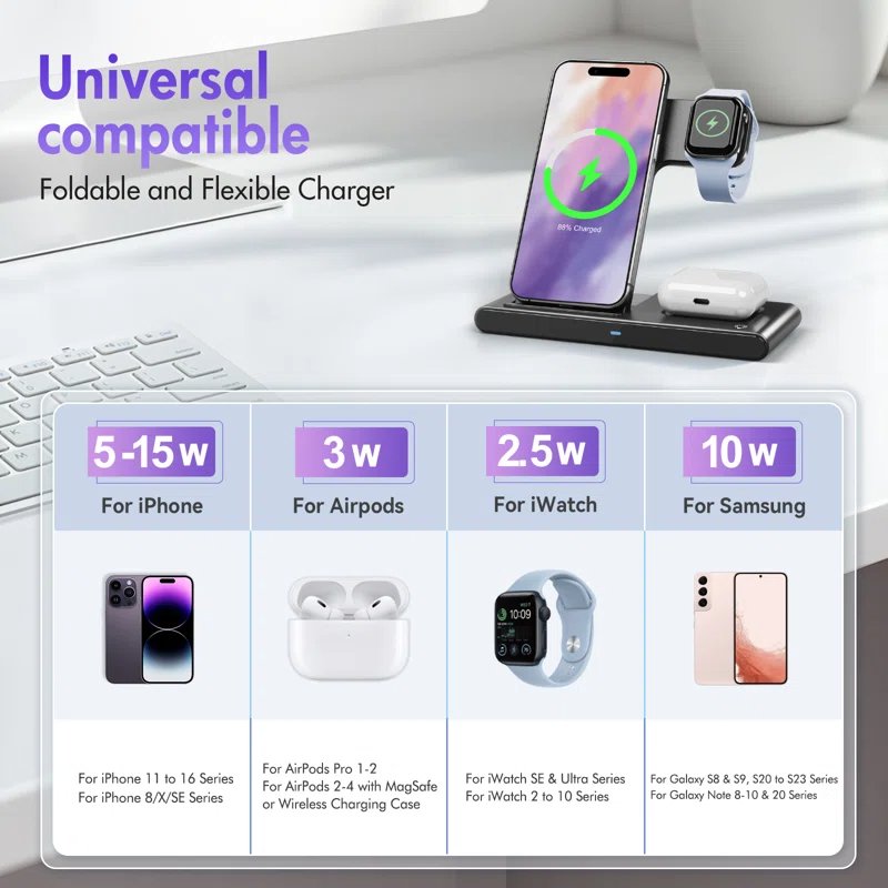 - Бесправадная зарадная прылада 3 у 1: Гэтая бесправадная зарадная прылада 3 у 1 прызначана для бездакорнай працы з рознымі прыладамі, у тым ліку з iPhone 16e 16 15 14 13 12 11 8 Pro Max Mini Plus X XR XS Max SE Plus Series, Apple Watch Series 10 9 8 7 6 5 4 3 2 SE і Ultra, AirPods 2 3 4 Pro 2 (Заўвага: для Airpods 2 3 4 патрабуецца зарадны чахол MagSafe). Ідэальны калядны падарунак для пары (мужа ці жонкі), сына, дачкі ці каго-небудзь з блізкіх.
